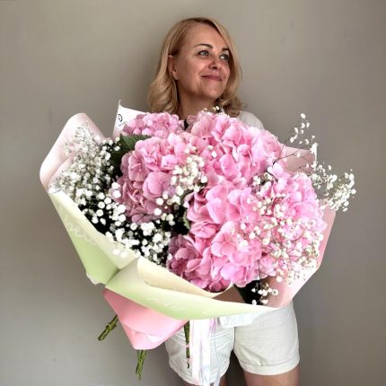 Большой букет с сиреневой гортензией и садовой розой: ароматный круглый букет