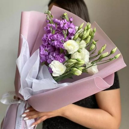 Букет из 11 фиолетовых маттиол и фисташки в стильной упаковке “Вайолет”