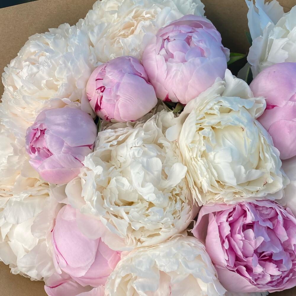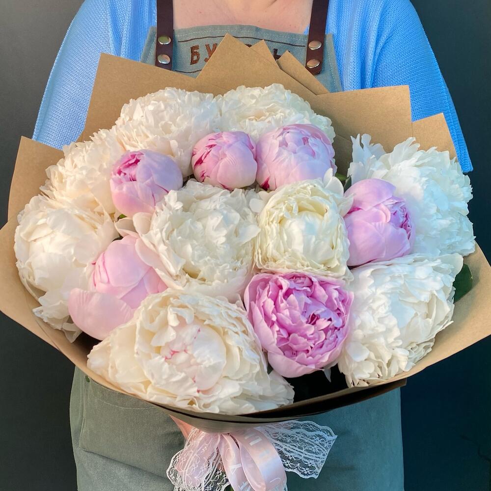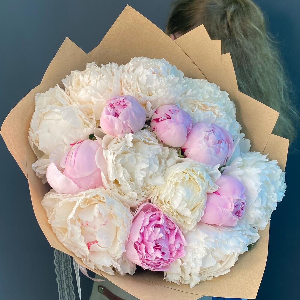 Большой букет из 15 Пионов в крафт бумаге . Выглядит невероятно красиво и нежно . Пломбирные шарики, словно мороженное в красивой обертке.