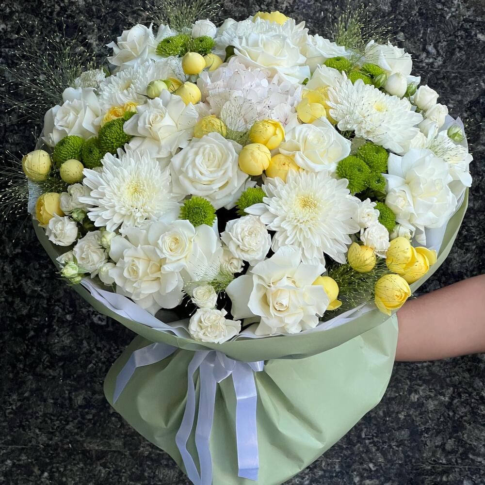 Гортензия – 1 шт. Роза – 13 шт. Спрей роза – 11 шт. Хризантема – 10 шт. Рускус – 5 шт. бумага дизайнерская – 1 шт.