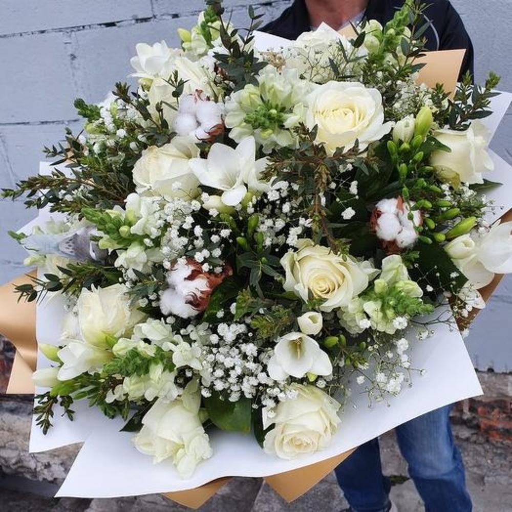 Гипсофила – 4 шт.Эвкалипт – 5 шт.Зелень – 25 шт.Роза белая – 19 шт.Фрезия белая – 10 шт.Упаковка дизайнерская – 5 шт.Львиный зев – 10 шт.Птичка декоративная – 1 шт.Хлопок натуральный – 5 шт.