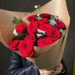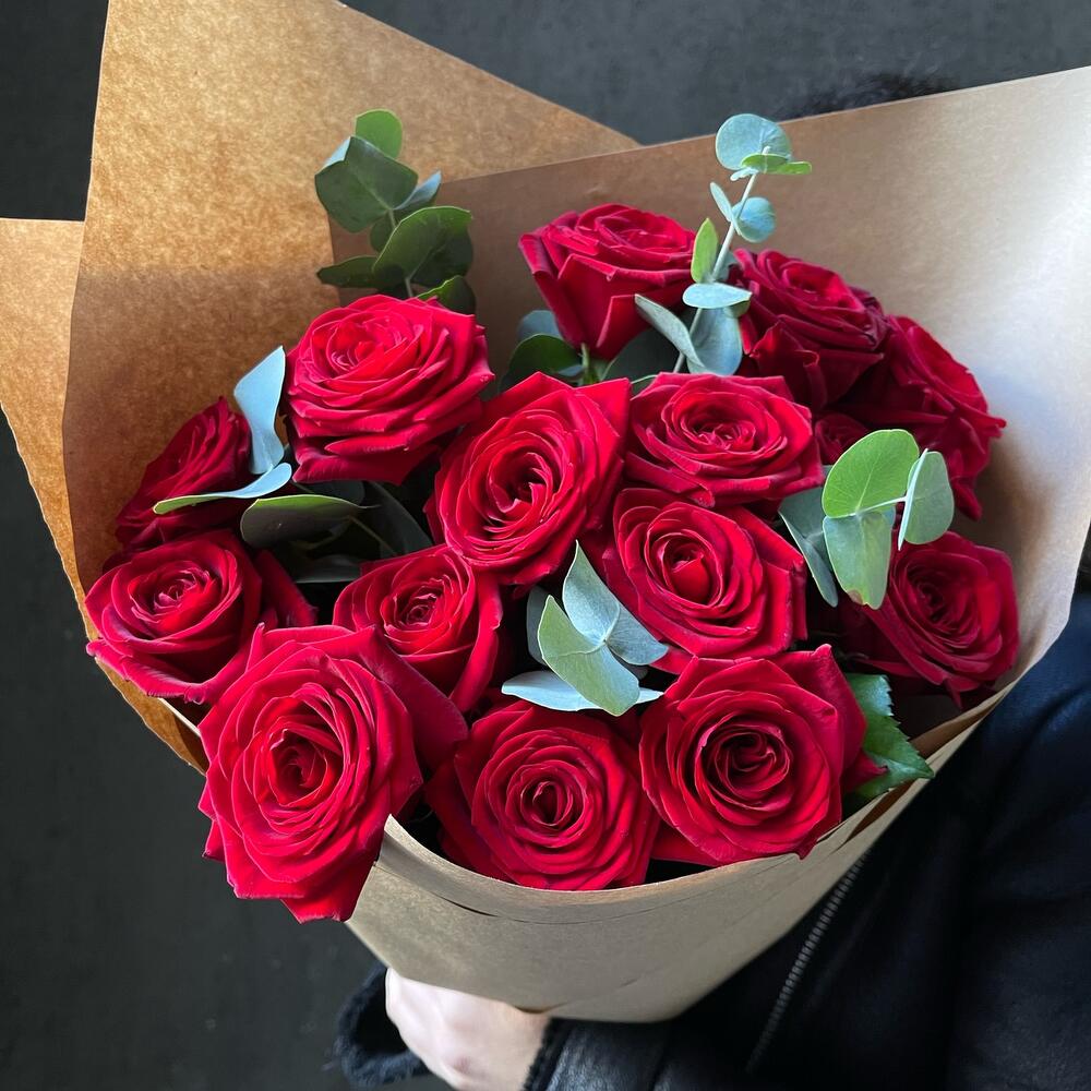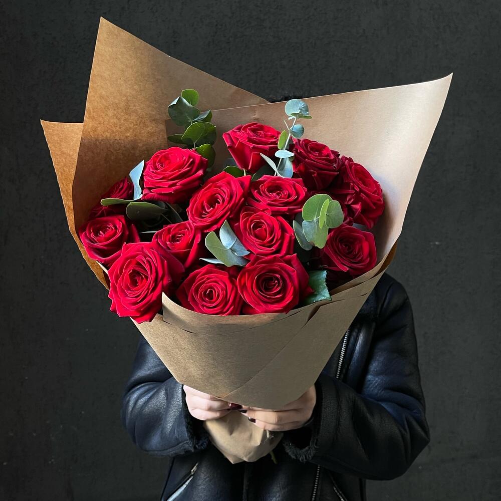 Эвкалипт – 3 шт.Упаковка дизайнерская – 2 шт.Роза красная 50 см – 15 шт.