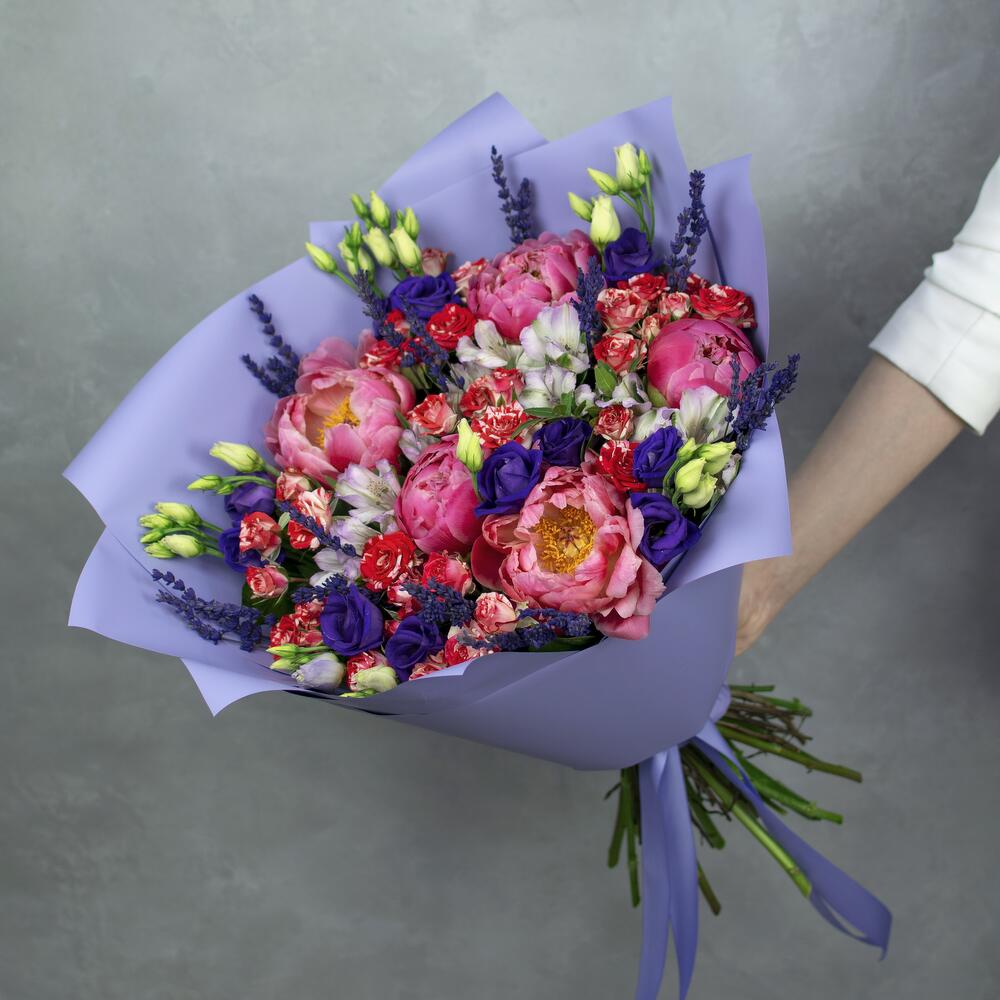 Пион коралл шарм – 5 шт.Лизиантус – 6 шт.роза кустовая fireworks – 5 шт.Альстромерия – 3 шт.Лаванда – 25 шт.