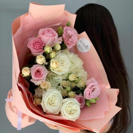 Альстромерии, Гвоздики, Кустовые розы, Лизиантусы, Розы, Хризантемы