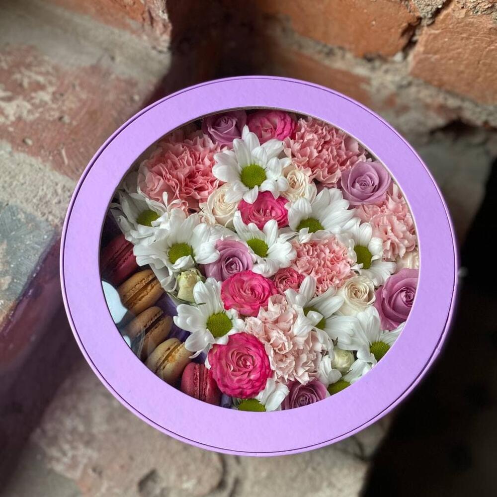 Букет из роз, хризантем, диантуса и макаронс в декоративной коробке “Сладкая встреча”