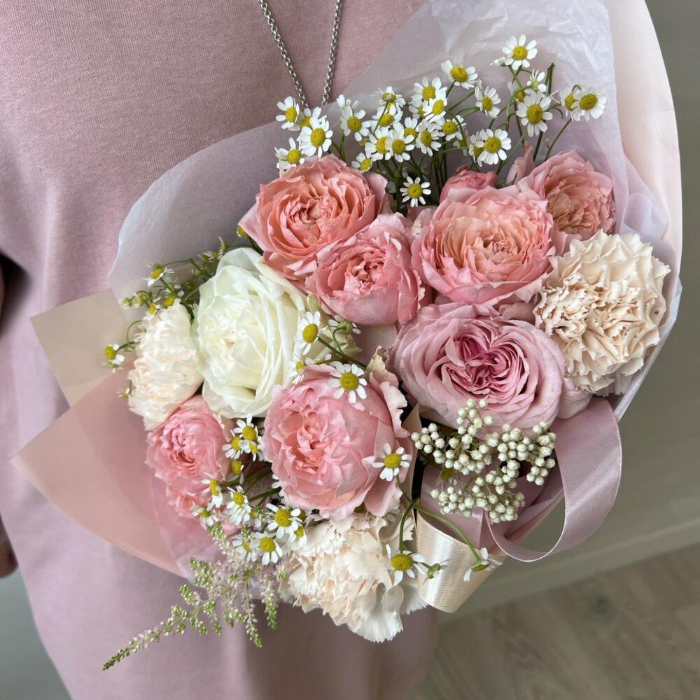 Пионовидная роза джульетта – 2 шт.Пионовидная одноголовая роза – 1 шт.белая роза – 1 шт.охотамнус – 1 шт.Гвоздика – 3 шт.ромашки – 5 шт.Лента – 2 шт.Аквапак – 1 шт.транспортировочный пакет – 1 шт.Кризал – 1 шт.