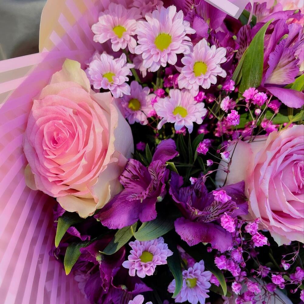 Роза премиум – 5 шт.Альстромерия – 3 шт.Хризантема кустовая – 3 шт.Фисташка пучок – 1 шт.Упаковка – 2 шт.Лента – 1 шт.