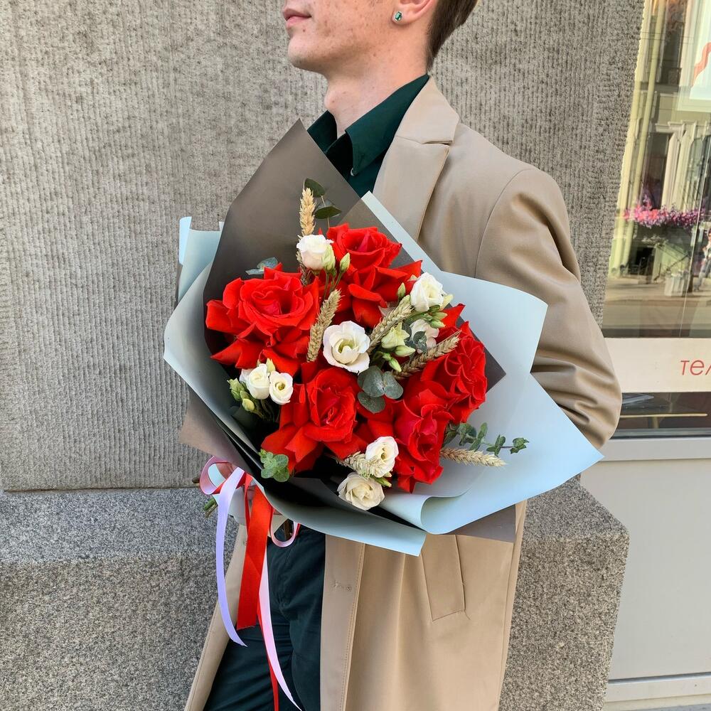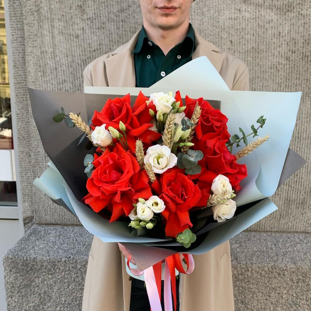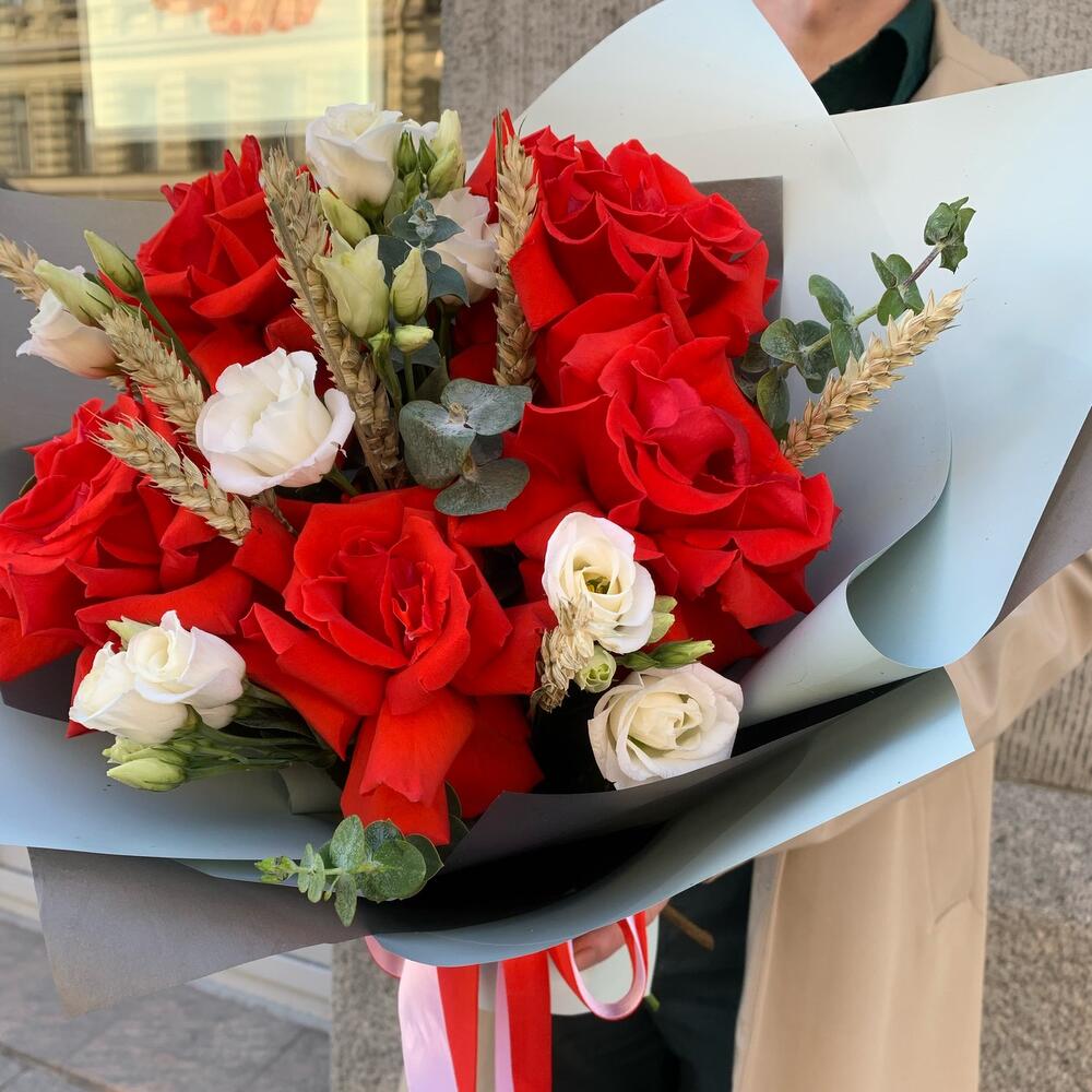 Лента – 1 шт.Эвкалипт – 5 шт.Пшеница – 7 шт.Упаковка дизайнерская – 2 шт.эустома лизиантус – 2 шт.роза французская нина – 5 шт.