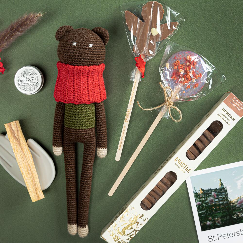 леденец ручной работы – 1 шт.букетик из сухоцветов – 1 шт.бальзам для губ laboratorium – 1 шт.благовоние пало санто – 1 шт.длиннолапый мишка ручной работы – 1 шт.подставка ладошка из гипсофила для благовоний – 1 шт.ириски “счастье” – 1 шт.ангел “счастье” – 1 шт.